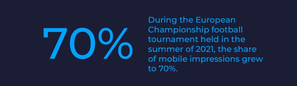 For example, during the European Championship football tournament held in the summer of 2021, the share of mobile impressions grew to 70%. When the data was recorded on 26 June, desktop’s share was 26% in comparison.